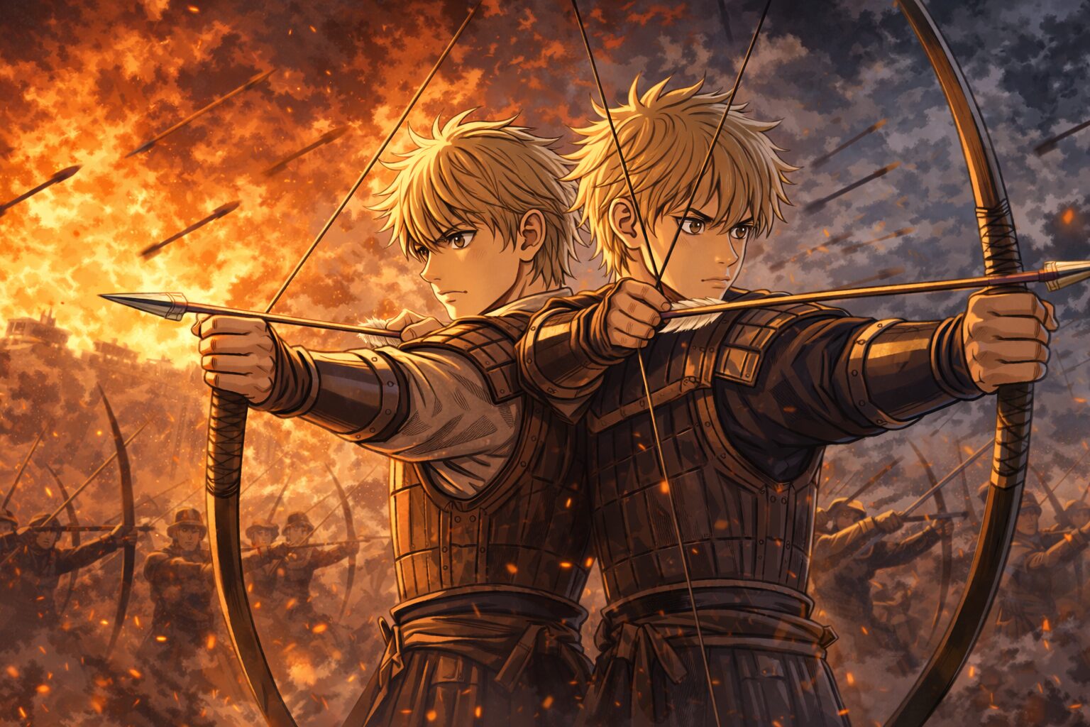 まだ若く、戦の空気にも慣れていない二人が、それでも弓を握る手を震わせずに構える。