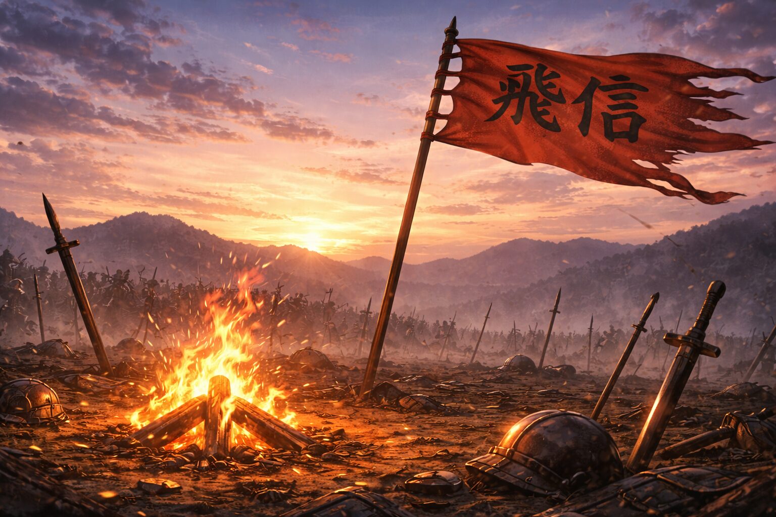 立ち上る砂煙の中で、信が掲げた旗が光を浴びる――それはただの勝利ではなく、未来への狼煙だった。